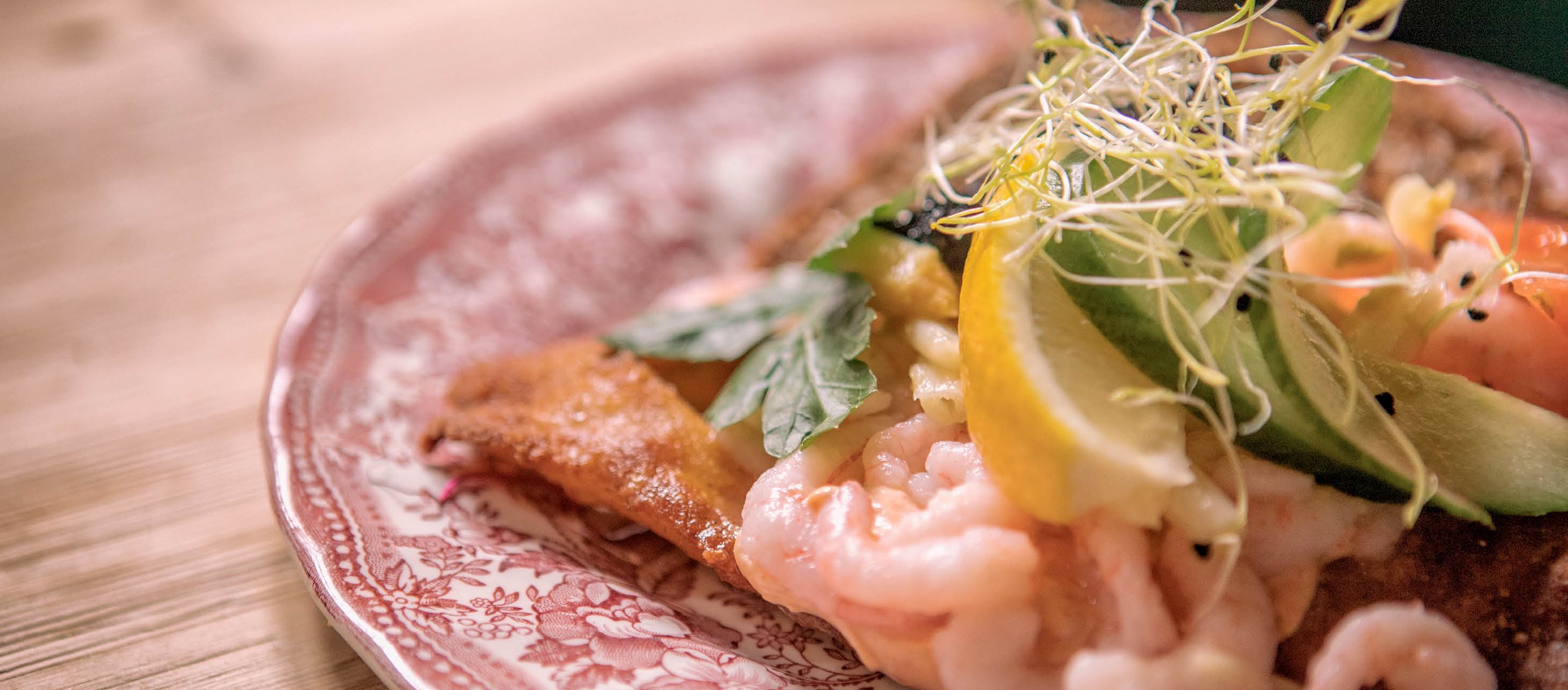 WEIS „SKUD“: GEBRATENES SCHOLLENFILET mit Dressing, Krabben, Spargeln, Kaviar und Schwarzbrot 168,-